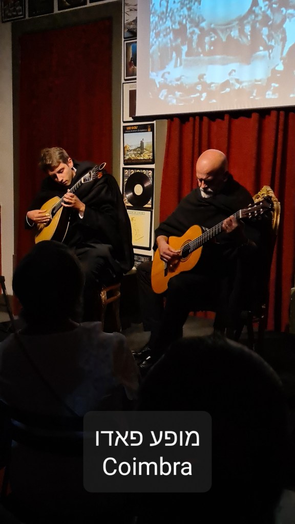 מוסיקת הפאדו – פשוט התאהבנו במוסיקה וכך קורה שבכל עיר שבה ניתן לשמוע שירה זו אנחנו הולכים להופעה. הפאדו הקלאסי זו מוסיקה עממית מסורתית שנוצרה כנראה בברזיל. לרוב מדובר בסרנדות שנושאן העיקרי – אהבה. הפאדו של קוימברה מכונה הפאדו של הסטודנטים. שרים אותו גברים בלבד. הוא מנוגן על ידי שני סוגי גיטרה – קלאסית והגיטרה של קוימברה. היינו בהופעה ונהנינו.