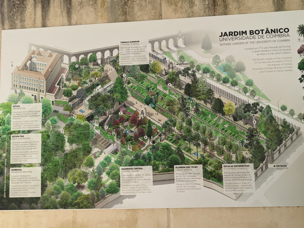הגן הבוטני של האוניברסיטה – הגן ניטע על ידי המרקיז פומבל. הגן מכיל חלקות יער למחקר, ערוגות תבלינים למישוש , הרחה וטעימה – פינות רומנטיות, פסלים ומזרקות. בגן נעשים עד היום מחקרים רבים בתחום הבוטניקה. הגן פתוח למבקרים מהשעה 08.00 ועד השעה 20.00 בגן שבילי טיול רבים הן ביער והן בין הפינות השונות. אמת המים של sao Sebastiao מהמאה ה-16 צמודה לגן זה. טיילנו ביער הגיבורים – היה קסום. בגינת התבלינים כתוב על כל ערובה – תריח אותי או תטעם אותי ועל כולן כתוב – תסתכל עלי.
