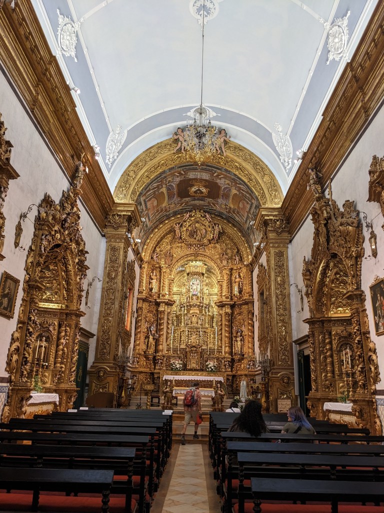 הכנסייה האחרונה בה ביקרנו גרמה לנו לצאת מזועזעים, קוראים לה בכנסיית נוסה סניורה דו כרמי Nossa senhora do carmo – לכנסייה שני מגדלים מרהיבים מבפנים כמויות אדירות של זהב משפחות מכל תחריטי העץ. מחיר כניסה 2 אירו