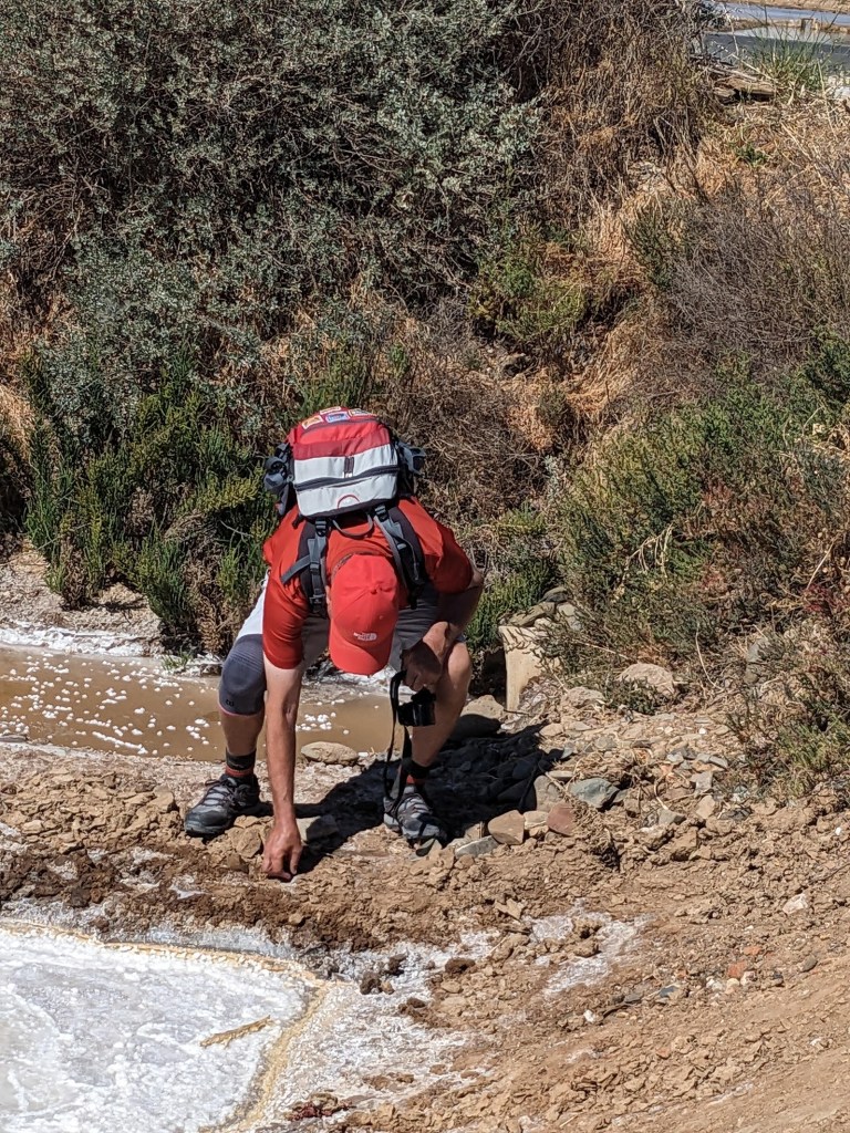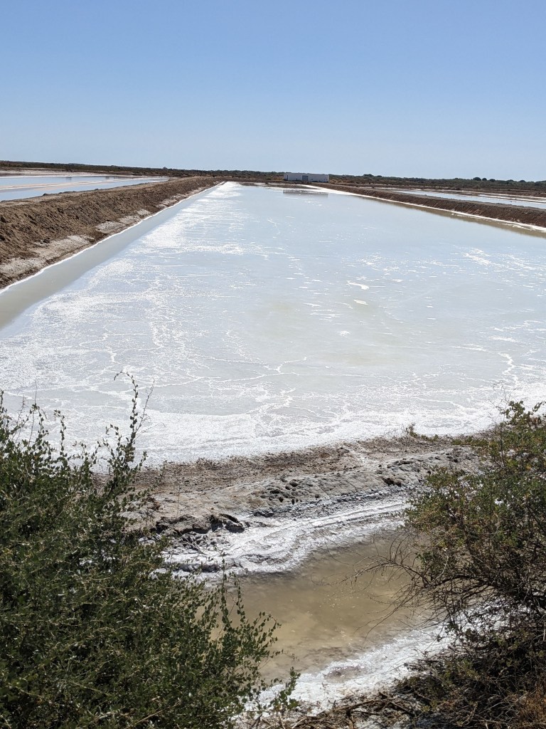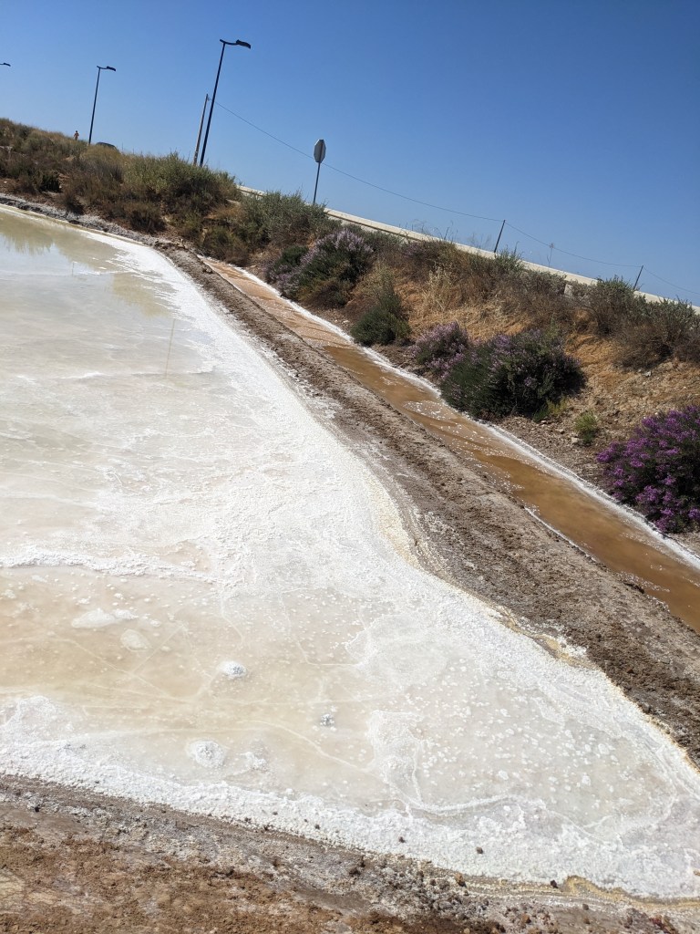 במרחק 2 ק"מ מעבירה נמצאים אגני המלח . עבודה קשה וסזיפית. מציפים בריכות במי הים ונותנים להם להתאדות. את המלח שנשאר עורמים בערימות גבוהות וממנו מייצרים את מלח השולחן רב הנתרן שאנו צורכים לסלט. רק חשבו על זה – החום כאן באביב מגיע ל-30 מעלות ובקייץ 40 ויותר. האנשים עובדים בחום הנורא עם המלח שנדבר אליהם…..