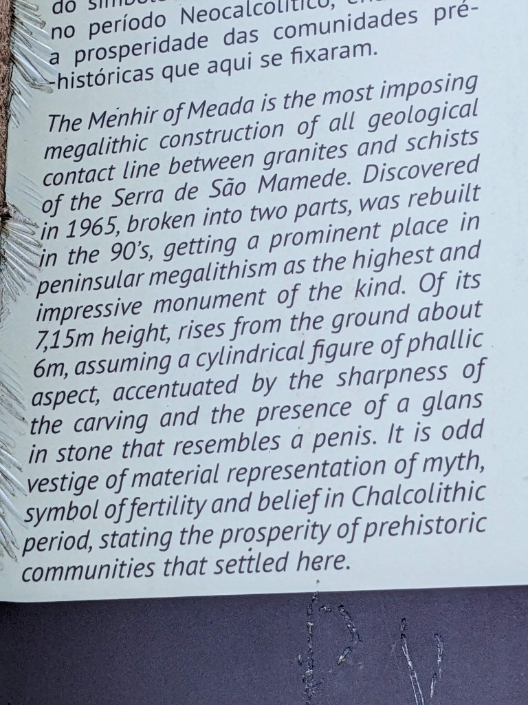 יצאנו בדרכנו צפונה לכוון שמורת Serra de Gardunha וכמובן שהיינו חייבים לבקר את ה-Menhir הגדול ביותר שנחצב בידיים אנושיות בחצי האי האיברי. גובהו 4 מטר וצורתו איבר פאלי. סמל הפריון והאמונה בתקופה הניאו כלכוליתית