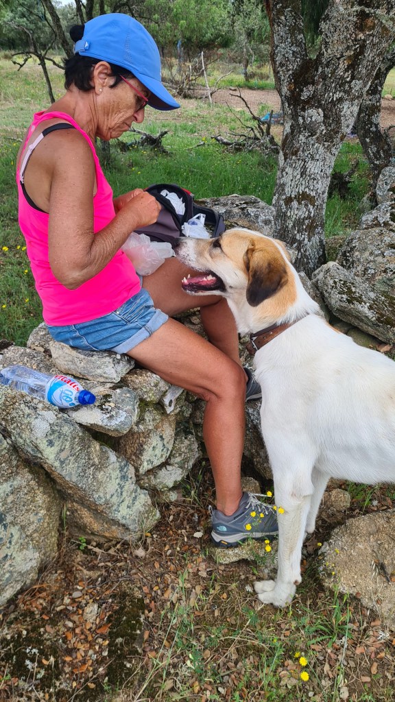 כלומר, באופן כללי ידענו מה התוכנית והלכנו על צבע אדום לבן (כמו אצלנו). כך יצאנו במצב רוח טוב והתחלנו ללכת. עוד תוספת קטנה, הכלבה הענקית של בעלת הבית ושמה קטלינה ושכבר מכירה אותנו היטב מצטרפת אלינו למסלול להפתעתנו ולשמחתנו.