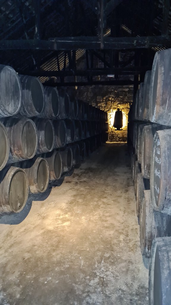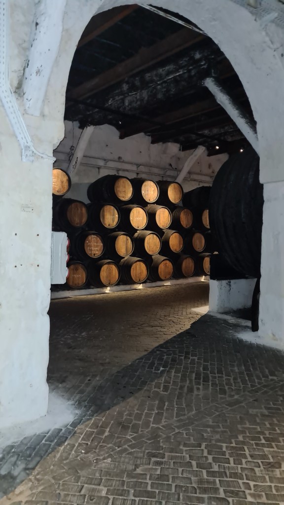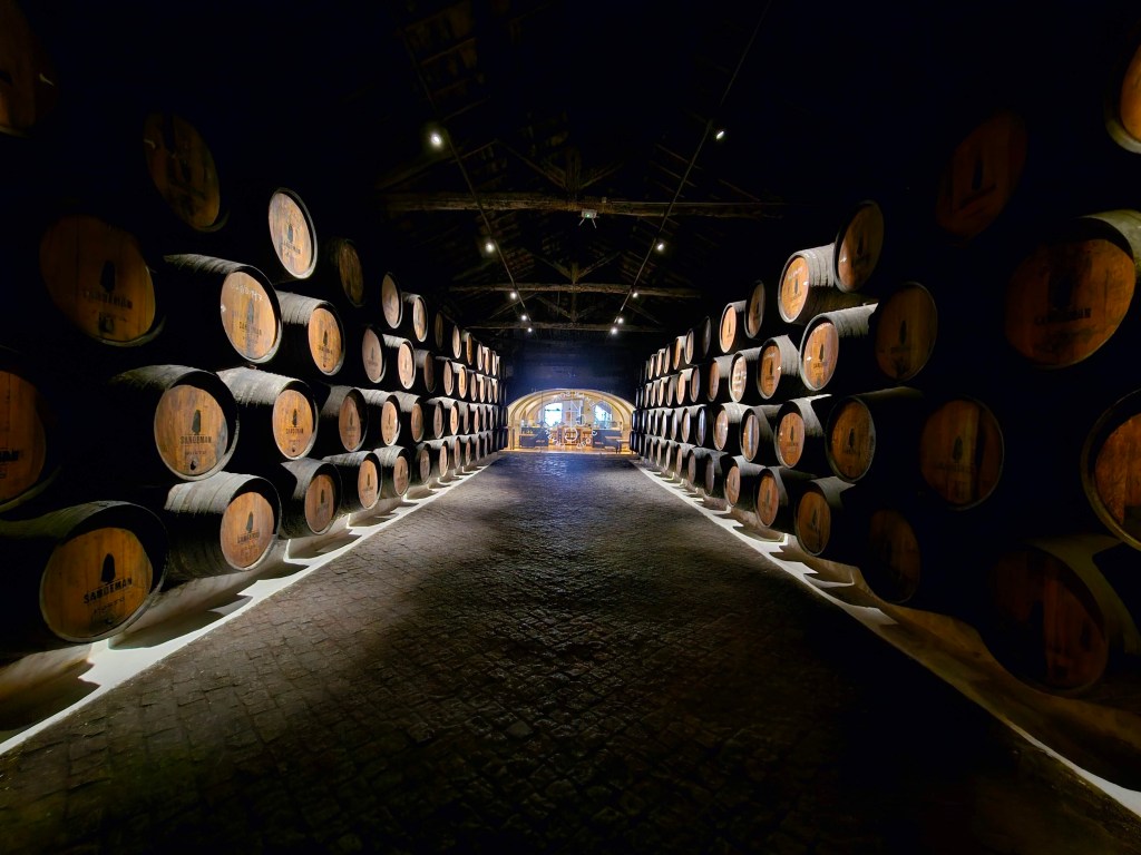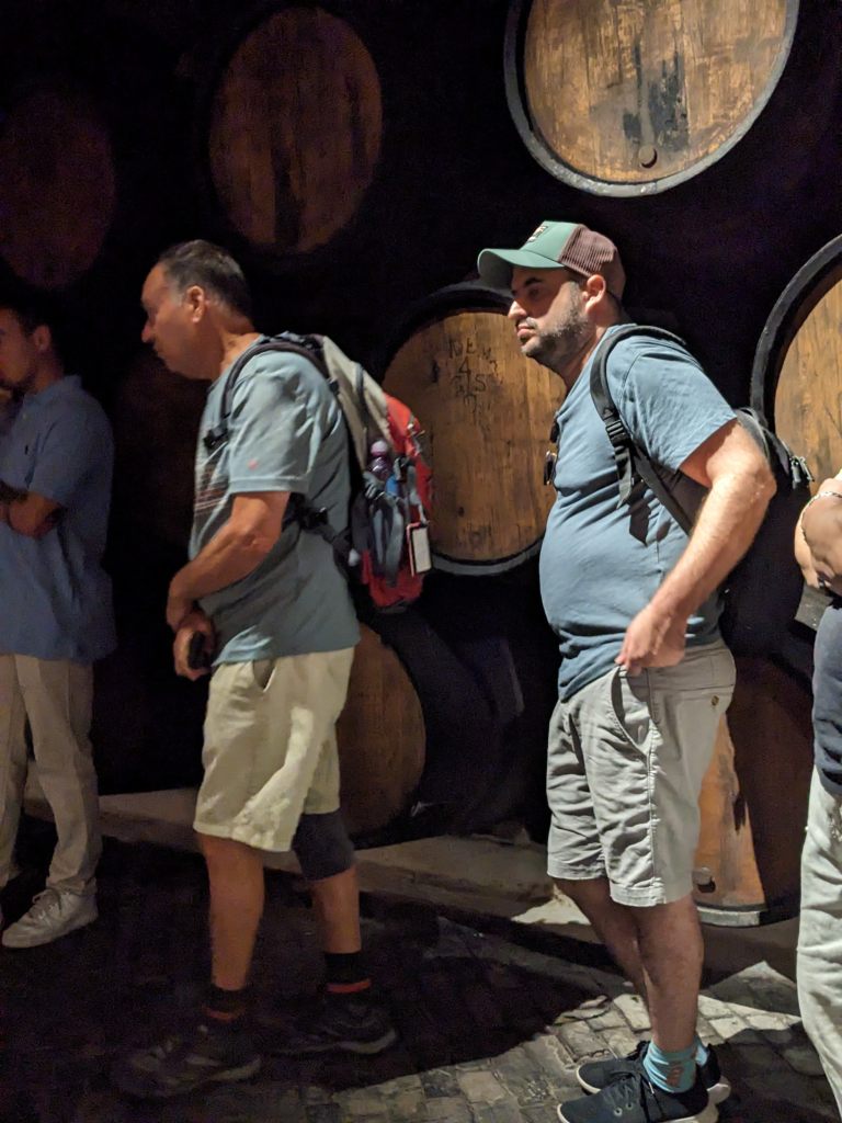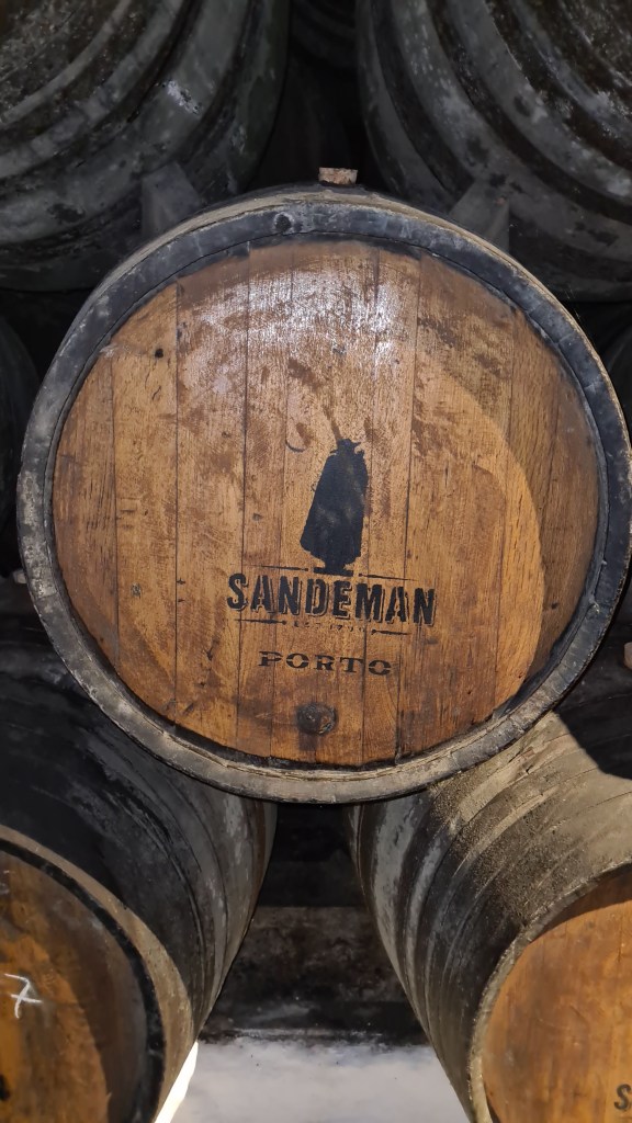 החלטנו לערוך ביקור במרתפי היין של חברה זו, היות וכבר היינו בעבר בסיור במרתפי חברת Grahms. דרור היה בביקור שבוע וביחד איתו הזמנו סיור מודרך באנגלית. קיבלה אותנו בחורה צעירה חמושה במשקפים ובחליפה המסורתית שהיא בעצם הלוגו של יקב סנדמן. האווירה מחשמלת, המרתפים חשוכים, מוארים פה ושם ולעיתים נורה כל שהיא שולחת קרן של אור. השקט לא מופר.