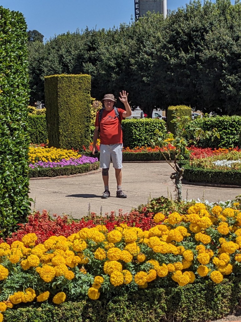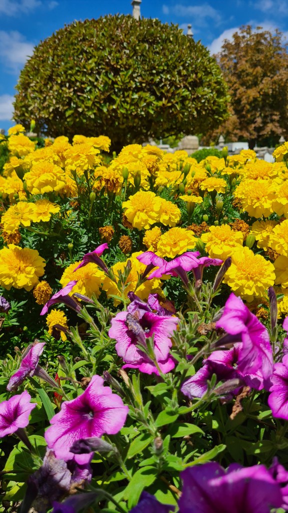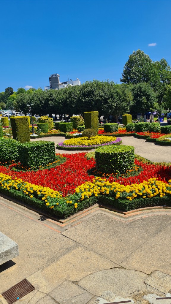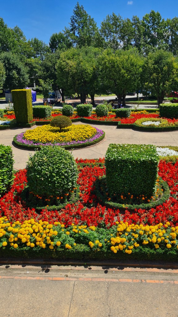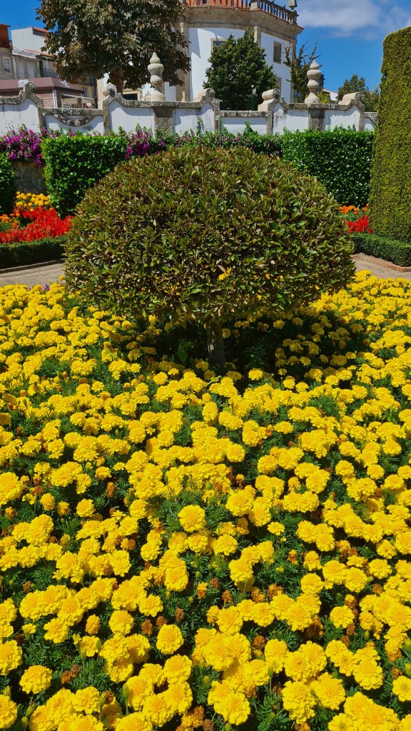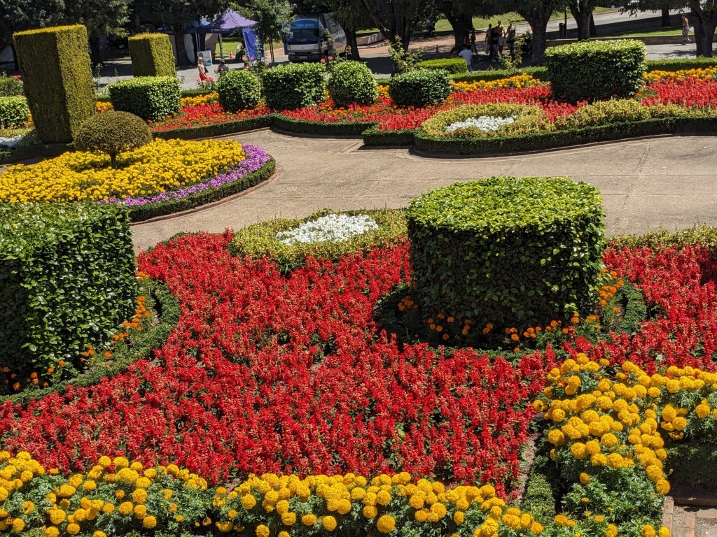 גן הפרחים ליד הכנסייה -הגן מעוצב בצורות גיאומטריות ומשלב בתוכו שלל פרחים בצבעים שונים.