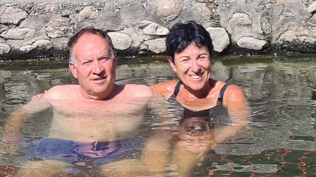 הגענו למקום חפצנו. עשרות אנשים יושבים על גדות נהר Caldo ועוד כמה מצטופפים בבריכה הרומית העתיקה. המים חמים – 40 מעלות אבל מלוכלכים באצות ומינים ברושים וזבובים.חיש קל לובשים בגדי ים (איבדנו כל בושה) בחנייה והולכים למים. לא מעניין אותנו שהאצות נדבקות אלינו היה נעים והרגשנו כמו שני היפופוטמים 😌😌😌 סביבנו מגדל בבל – אנגלית , פורטוגזית ובעיקר צרפתית. הם כבשו את הארץ. חצי שעה בהחלט הספיקה ויוצאים לדרך.