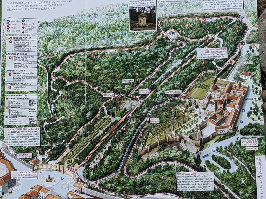 מאטה נסיונל דוש סטה מונטש – Mata nacional dos Sete Montes = גנים מקסימים המקיפים את המבצר עליו סיפרתי לעיל. הגנים נשתלו על ידי הטמפלרים כדי לשמש מקום מדידטיבי. היום יש בגנים אלה שבילי הליכה, מקומות לפיקניק, מתחם לילדים וגם……נדנדה למבוגרים !!!