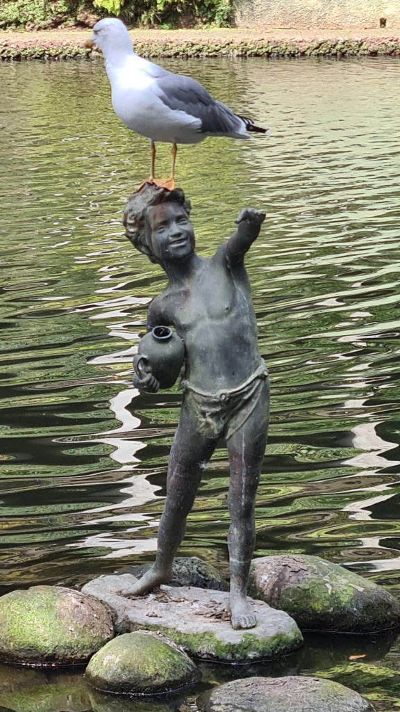 ברחבי הגן מפוזרים פסלים יפיפיים של אבן וברונזה.